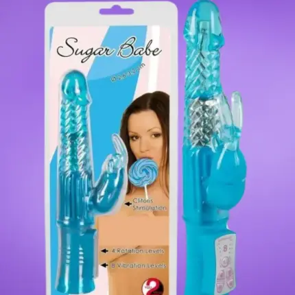 Kellemesen ruganyos bevonattal ellátott Sugar Babe - gyöngyös, nyuszis vibrátor, forgó, beépített masszírozó gyöngyökkel, formált makkal, spirálisan bordázott, stimuláló felszínnel, körbe-körbe forgó fejjel, valamint nagyon puha, nyuszis klitoriszkarral.