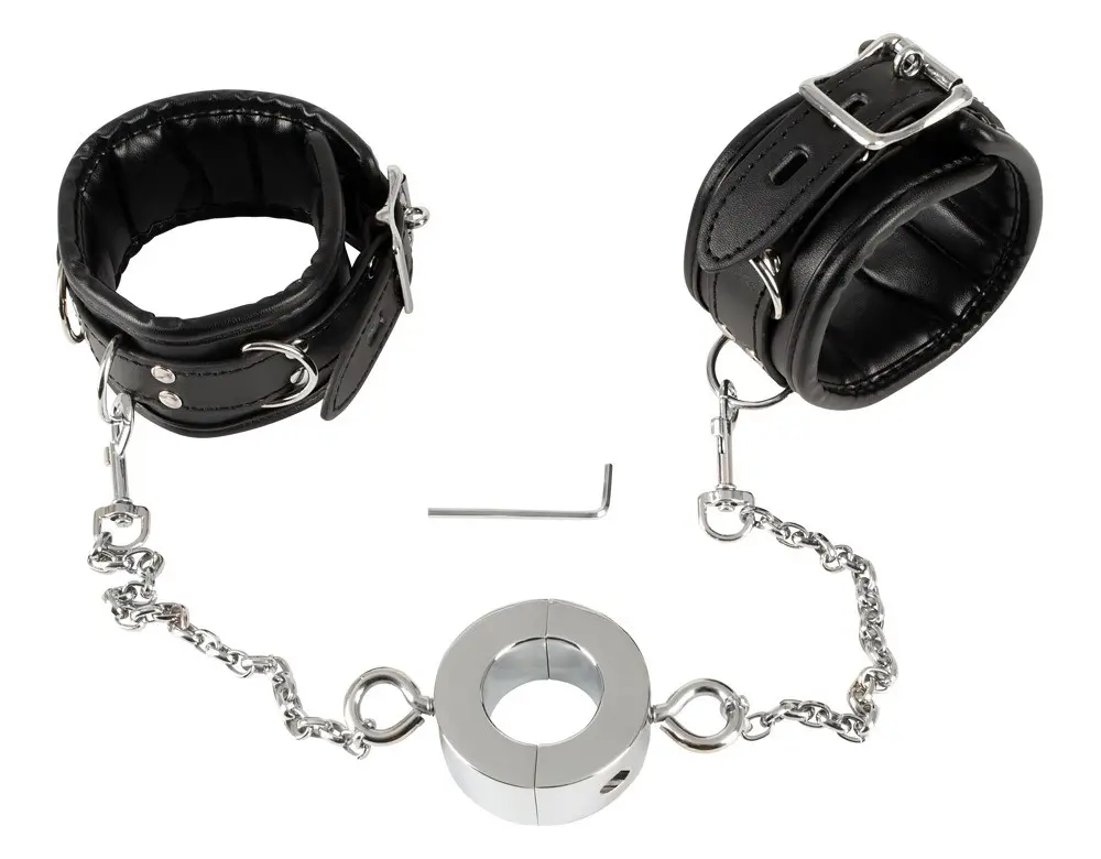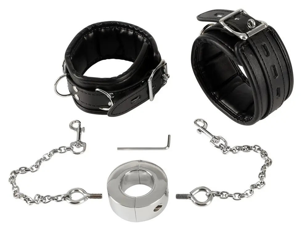 Fekete műbőr bilincskészlet és egy acél kakasgyűrű a legvadabb rabszolgajátékhoz.