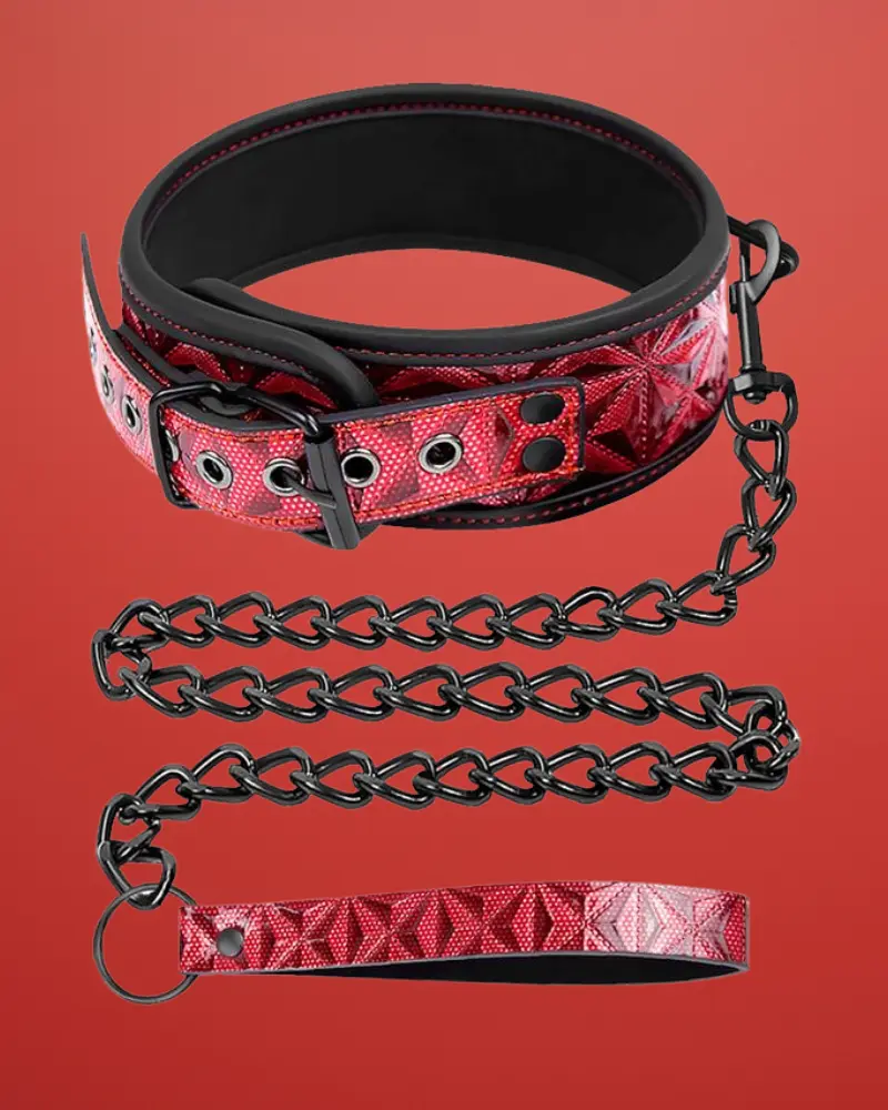 A kollekció tartalmaz egy vegán bőr nyakörvet és bilincset, melyek fém lánccal vannak összekötve. A nyakörv és a bilincs is csattal állítható, így kínálva kényelmet és biztonságot a legerotikusabb és legperverzebb kalandjaidhoz.