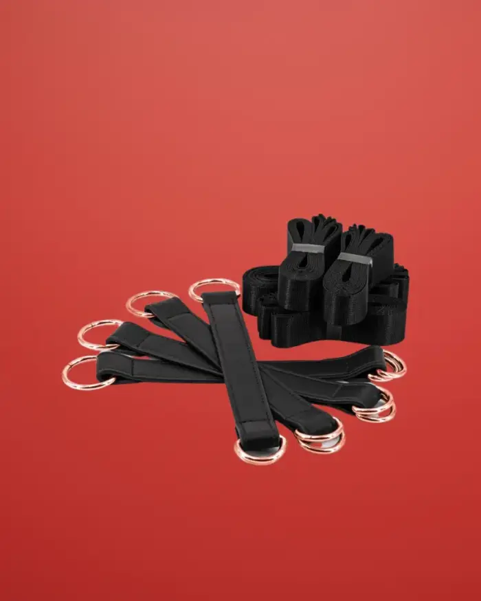 Ezek a kikötözők nagyon sokoldalúak, bárkit olyan pozícióba rakhatsz amilyenbe csak szeretnéd. A csomag tartalmazza a kikötözőt ami az ágyhoz rögzíthető, és a 4 kapcsolódási pontjának köszönhetően, szinte bármilyen méretű matrachoz ideális. Ezenkívül csuklóra és bokára való bilincseket is tartalmaz.