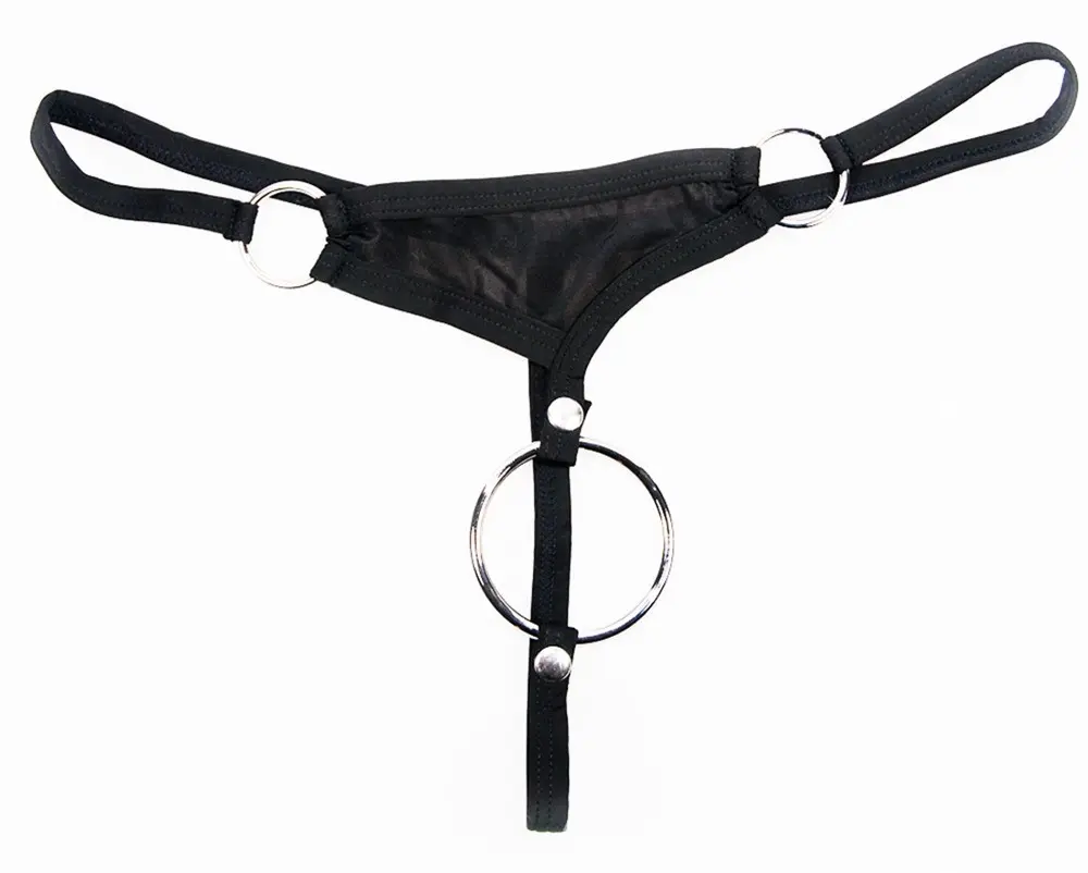 Fekete tanga levehető (gombos) péniszgyűrűvel (Ø 5 cm). A zsinór puha mikroszálból készült, és anyaggal borított pántokkal rendelkezik.