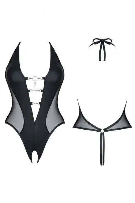Ragadozó “nyitott fenekű” test mély, függőleges szabással, vonzóan mutatja a nyakkivágást. A szabást 3 vízszintes fémlánc és egy fém tüskés ezüst kör díszíti. A fekete eco-bőrt és az oldalán finom hálót összekötő puha függőleges vonalak optikailag karcsúsítják az alakot. A hátoldalon szexi, meztelen hát, fenék és csípő látható. A nyak hátsó részén található kényelmes fűzés megkönnyíti a felszerelést.