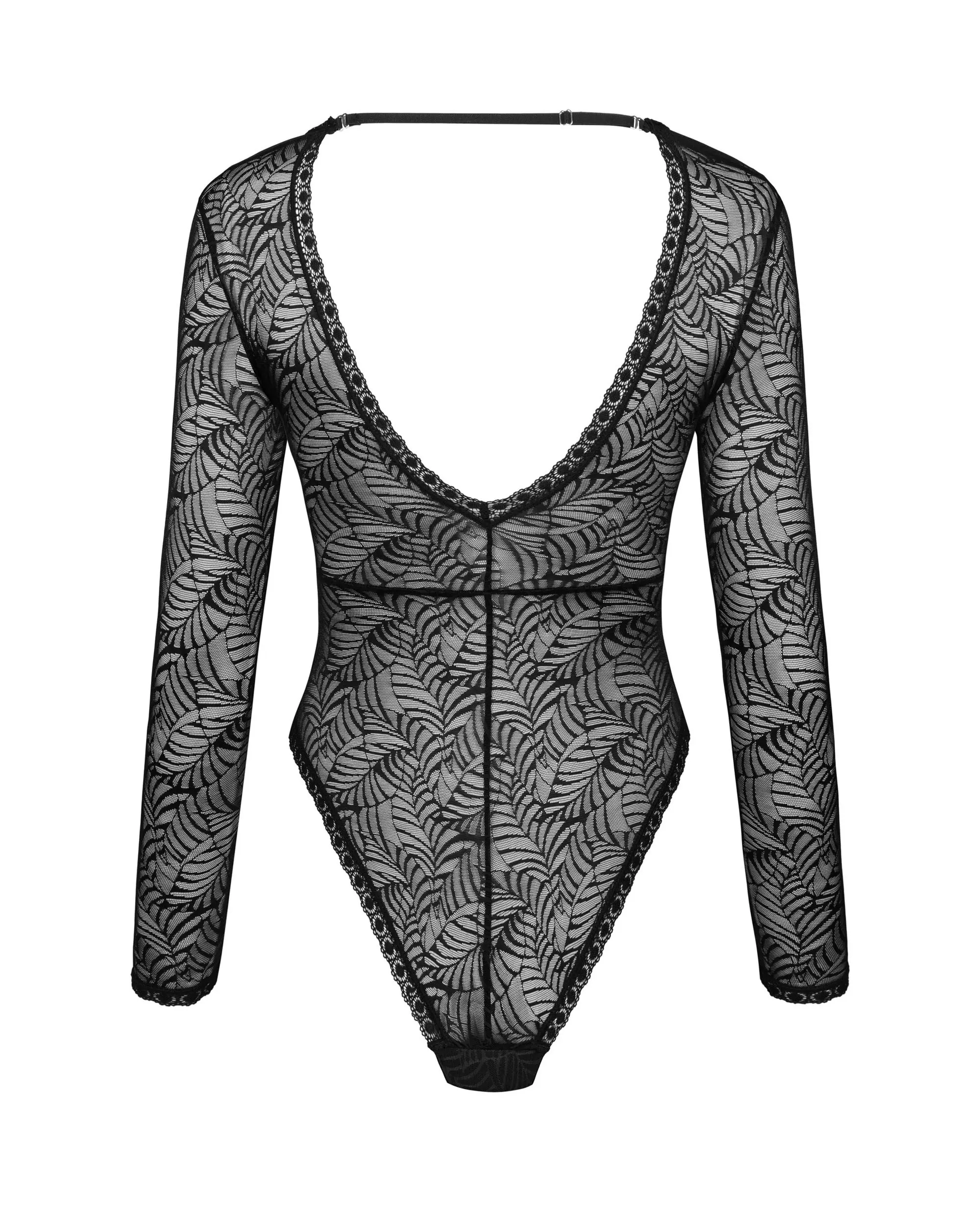 Prémium minőségű, nagyon rugalmas virágmotívumos tüll és csipke kombinációjából készült, hosszú ujjú body. Elöl a csipő fölött különlgesnek mondható, fűzős berakással.