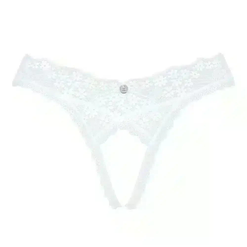 Rugalmas, csipkés anyag, kisebb részt puha tüll kombinációjából készült, az intim résznél nyitott tanga.