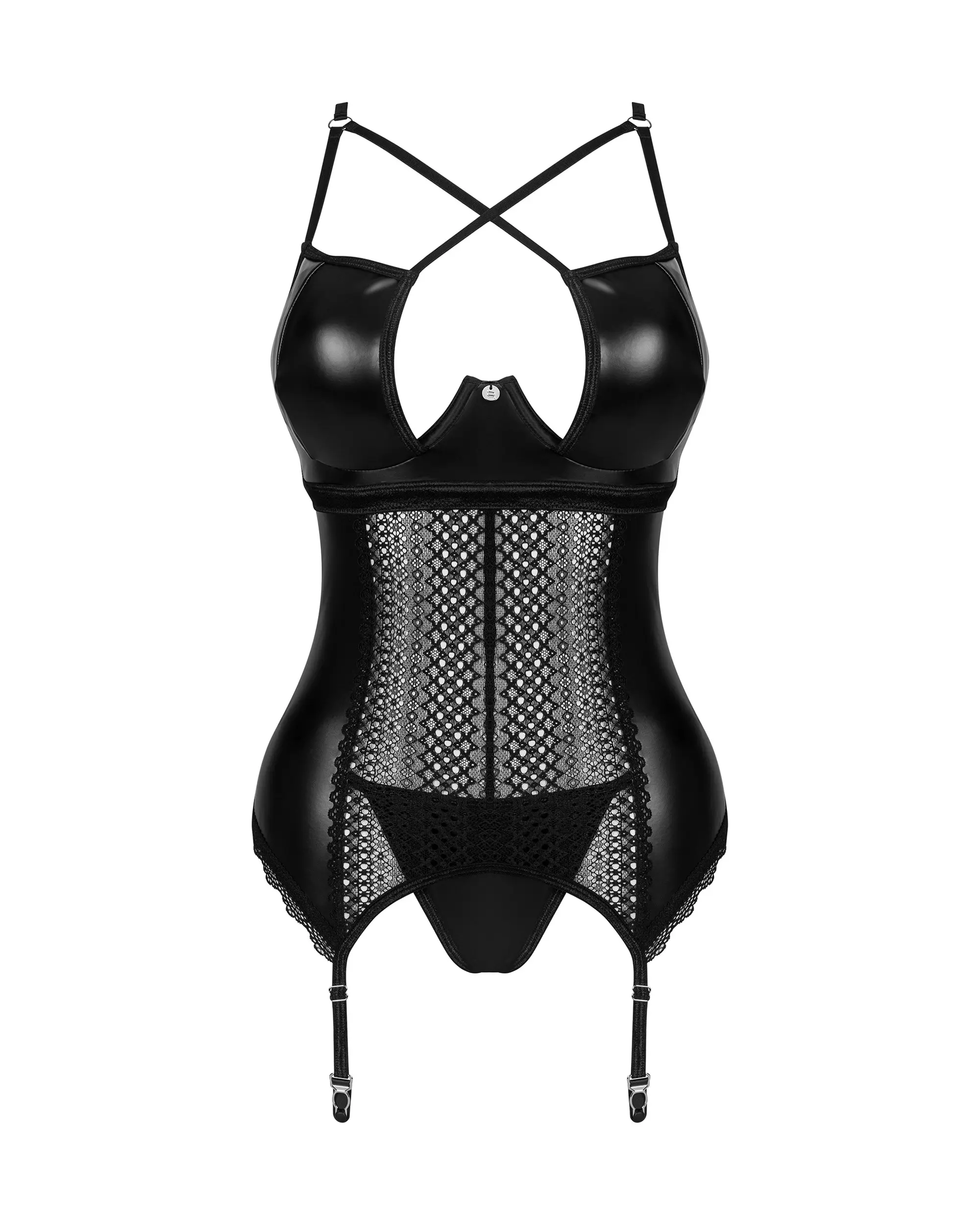 Nagyrészt vékony, nem áttetsző, rugalmas, nedveshatású, félfényes anyagból készült fűzős jellegű felső, melyen elöl és hátul áttetsző csipkebetét találunk. Hátul ebben a csipkés részben egy dekoratív, fűzős díszítőelem van, ahol még jobban testhez igazíthatjuk e dekoratív holmit.