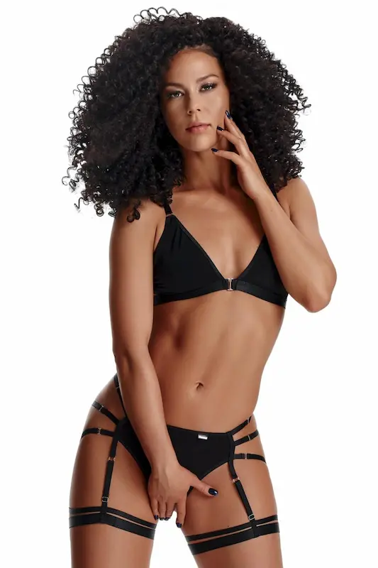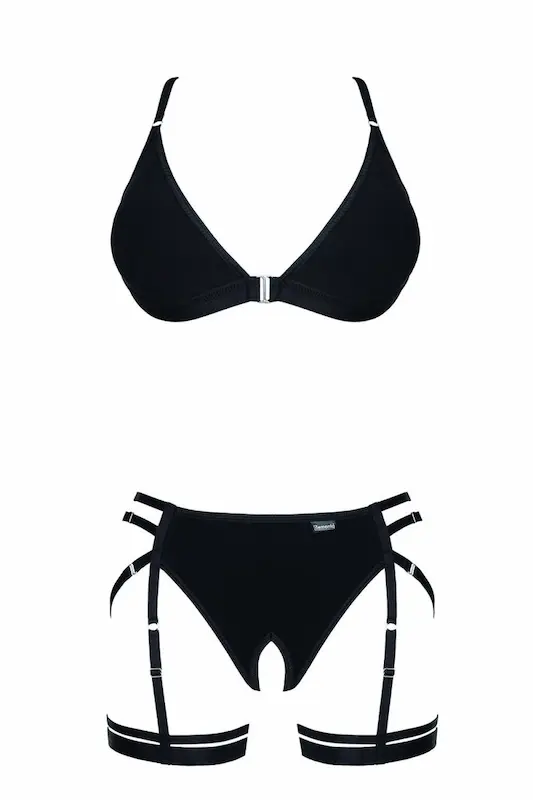 Nyitott aljú tangák, elöl harisnyakötővel összekötve. Hátul lenyűgöző gumiszalagok fémmel, dekoratív ezüst állítókkal. A számos szabályozónak köszönhetően a készlet tökéletesen a testhez illeszthető.