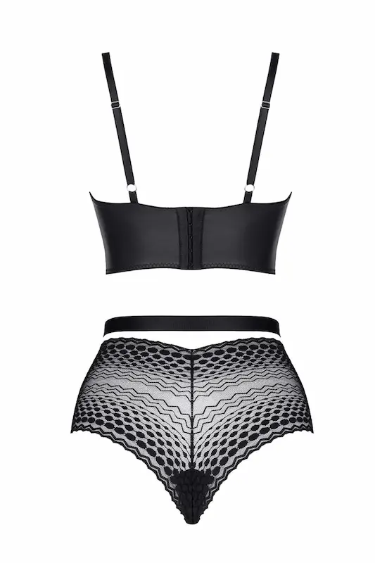 A melltartó gyönyörű a fekete, geometrikus csipke és matt wetlook anyag hatékony kombinációjának köszönhetően. A melltartó csészéi és oldalai speciálisan aládrótokkal vannak megerősítve. Ennek a megoldásnak köszönhetően a mellrész és a dekoltázs nagyon ínycsiklandóan néz ki. A tökéletes illeszkedést a vállpántokon található állítóelemek és a dupla állítású hátsó kampós zárás biztosítja. Minden ezüst elem fém – tartós és hatékony.