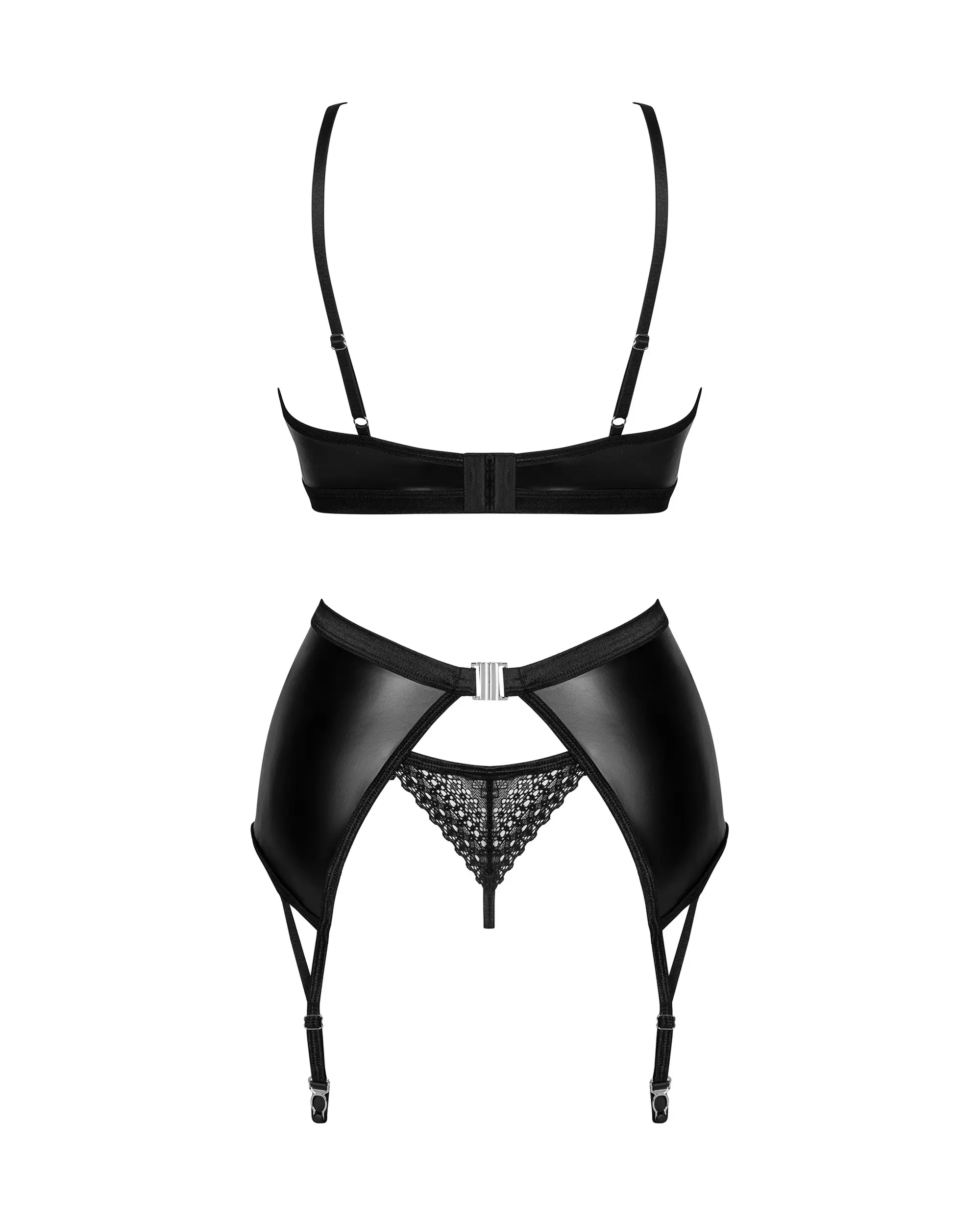 Nagyrészt vékony, nem áttetsző, rugalmas, nedveshatású, félfényes anyagból készült szett. Melltartórésze merevítéssel rendelkezik, vállpántjai méretre állthatók. A mellek alatt hátrafutó, igen rugalmas keresztpántja, 3×3-as kapocssoron záródik.