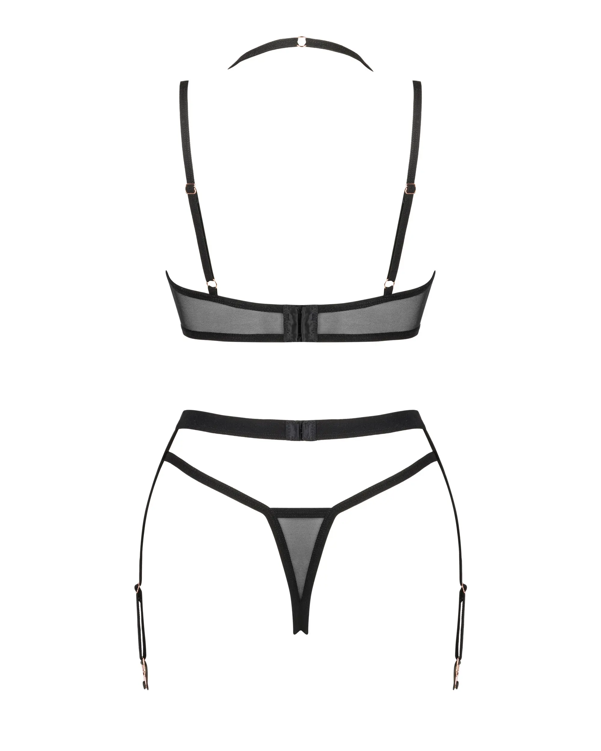 Egyrészt szaténos, nem áttetsző anyag, másrészt áttetsző puha tüll kombinációjából készült összeállítás. A melltartó rugalmas vállpántjai méretre állíthatók, hátsó keresztpántja is rugalmas, itt 3×3-as kapocssoron záródik. Nyakpántos-megkötős kosara alul kontúrcsíkkal van díszítve, benne merevítést találunk. A kicsiny alsó rugalmas pántjai az arany színű díszítőelemeknél méretre állítható, elöl szaténos, hátul tüll anyagból készült. A harisnyatartó pánt kicsit szélesebb rugalmas gumipánttal van ellátva, amiről leereszkednek a szintén rugalmas és méretre állítható tartópántok, egy tüll diszítőelemen keresztül.