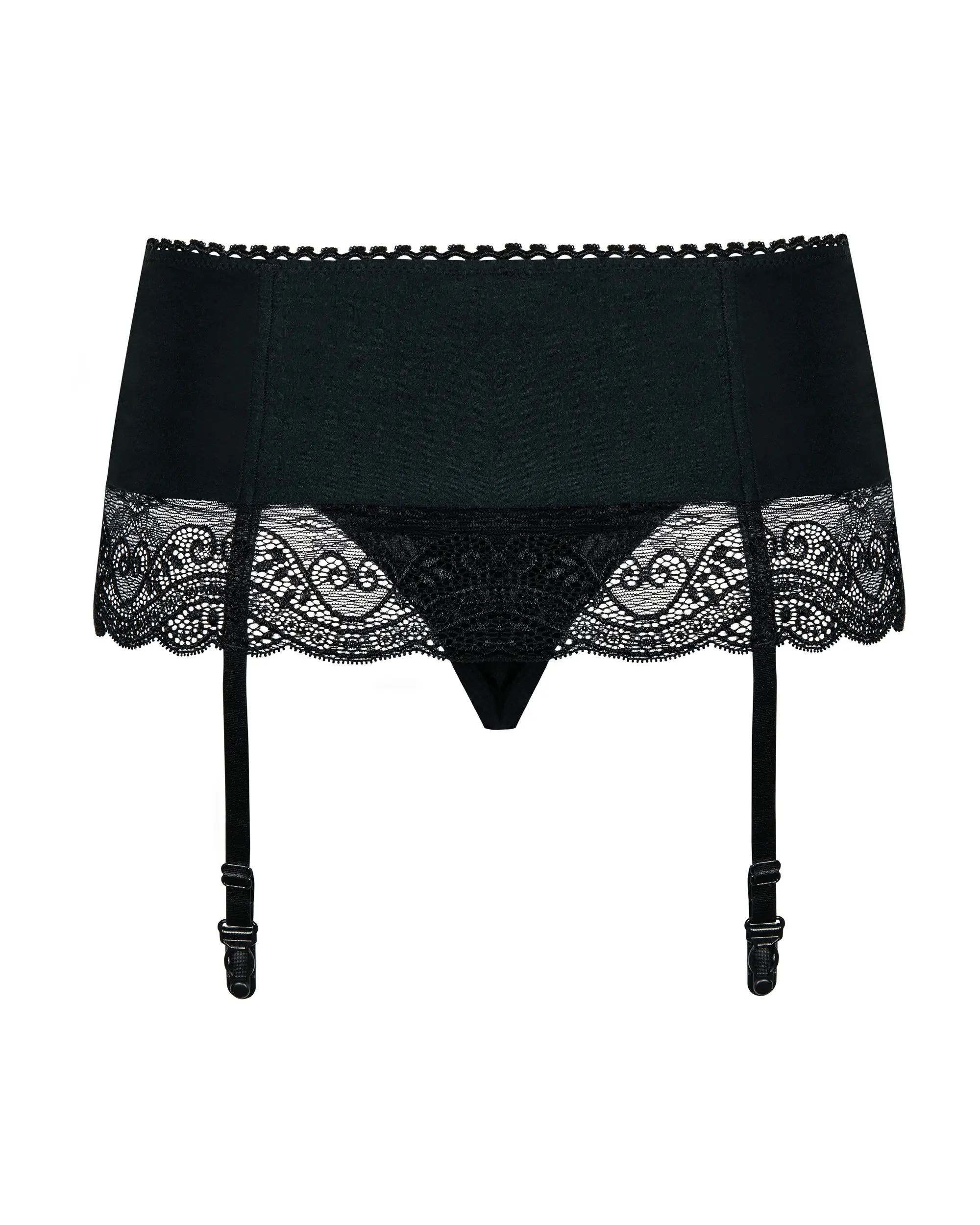 Prémium minőségű, rugalmas, csipkés anyagból készült széles harisnyatartó, négy darab pánttal. A hozzá illő alsó szintén a szett része. A harisnya viszont nincs a dobozban, azt sajnos külön kell megvásárolni.