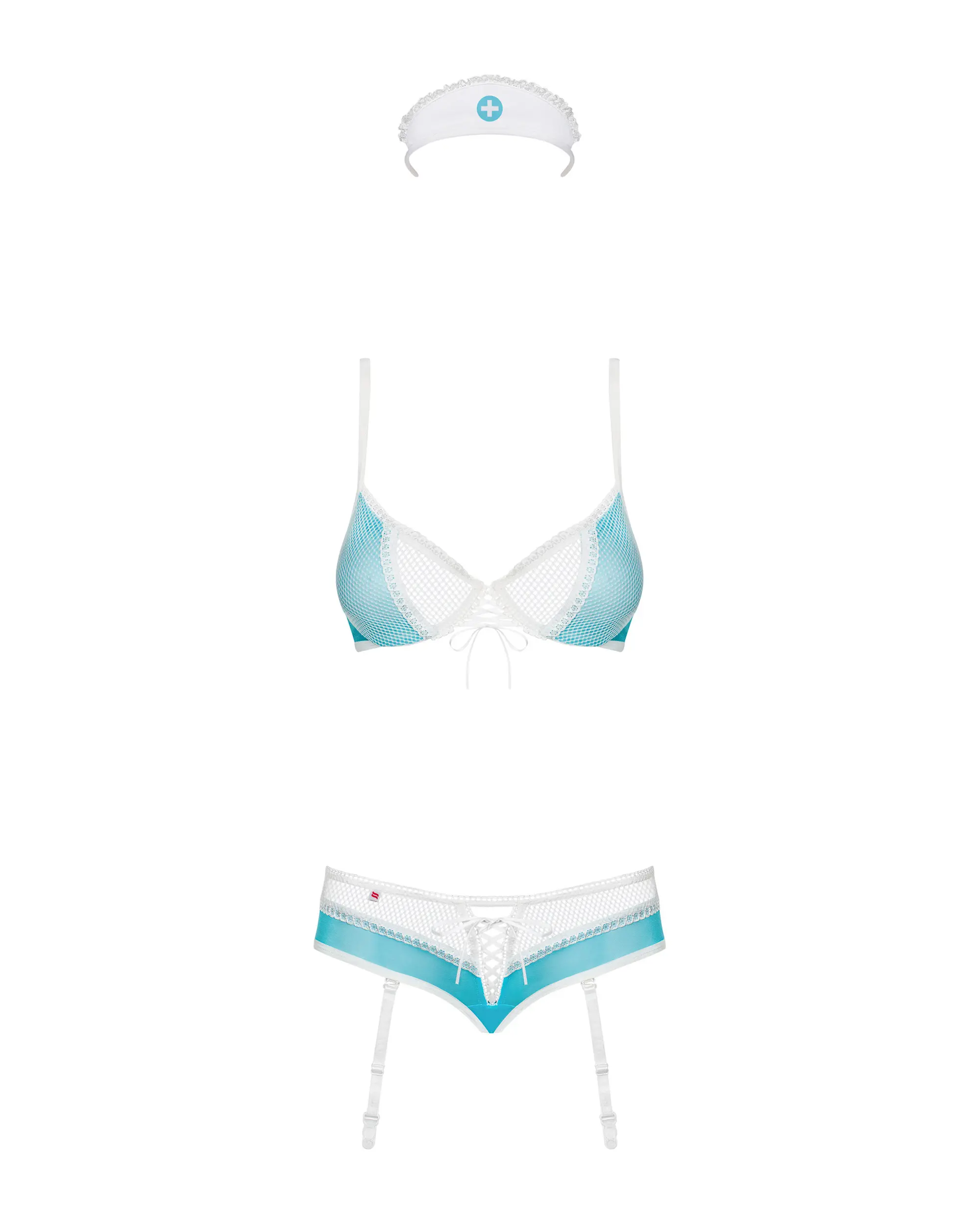 Visszafogott, részletgazdag ápolónő szett. Rugalmas, kék és fehér necc és finom tüll anyag kombinációjából. A melltartó merevítéssel rendelkezik, hátul a kapcsoknál és a vállpántokon méretre igazítható. A szalagos fűzős elem az alsón is megtalálható, az azon lévő négy darab, méretre állítható pánt, levehető róla. A dobozban a harisnyát sajnos nem találjuk meg, de a témába vágó, fejráfot igen.