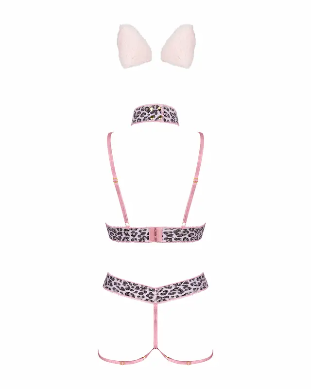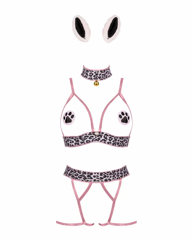 Kedves, visszafogott kellékeket tartalmazó készlet, könnyed kutyusos szerepjátékokhoz. A csomag tartalmaz egy főként pántokból álló, combpántos alsót, egy szintén nyitott melltartót, melyeken a rugalmas gumpántok méretre állíthatók, a széles gumis keresztpántja pedig 2×3-as kapocssorral van ellátva hátul. Egy csengettyűs nyakörvet, ami 2×2-es patentsoron záródik. Két fülecskét, ami egy-egy csattal erősíthető a hajba, valamint két darab tappancsos díszítésű, öntapadó mellbimbódíszt is.