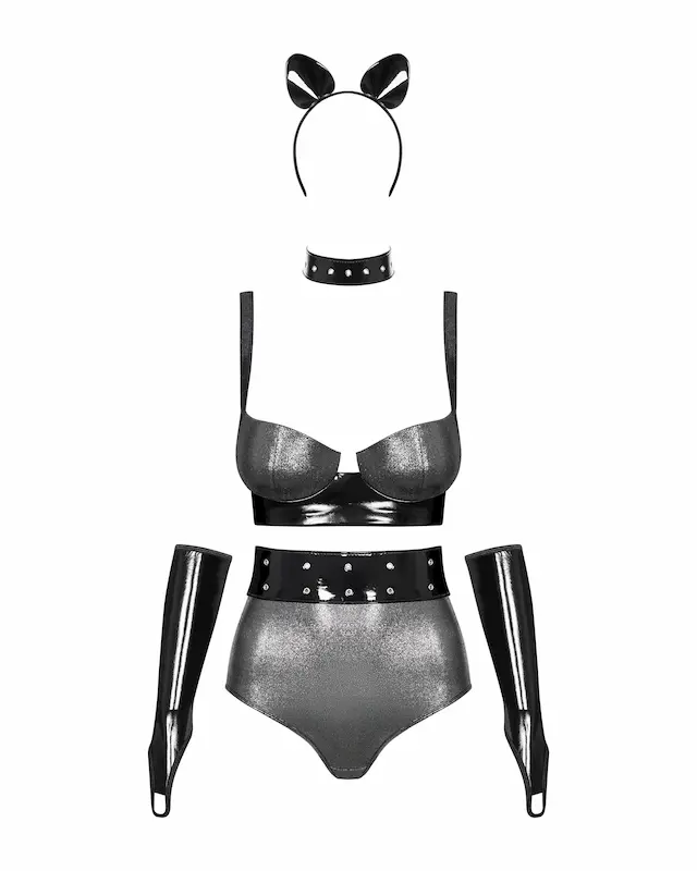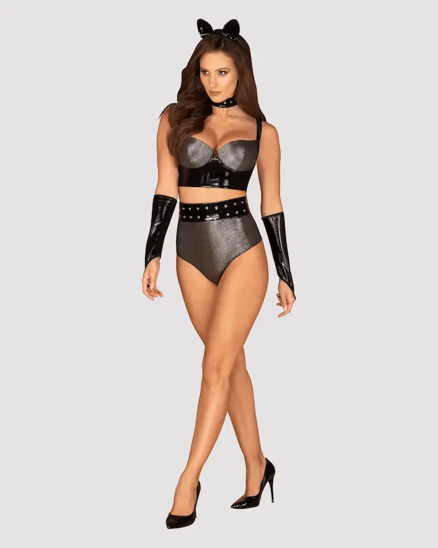 A két darab ujj bújtatóval ellátott kesztyű rugalmas anyagból készült. A műanyag kerettel rendelkező fejráf fekete anyaggal van burkolva, rajta pedig két macskafület találunk, szintén lakk anyagból.