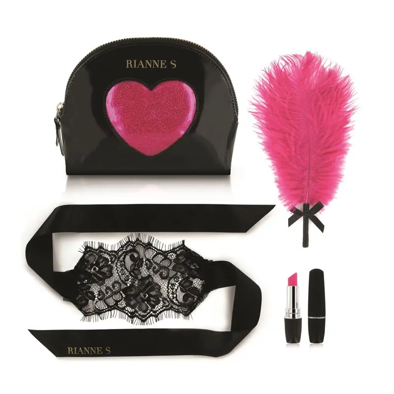 A gyönyörű kozmetikai táska egy diszkrét rúzsvibrátort, egy toll cirógatót és egy érzéki kendőt tartalmaz.