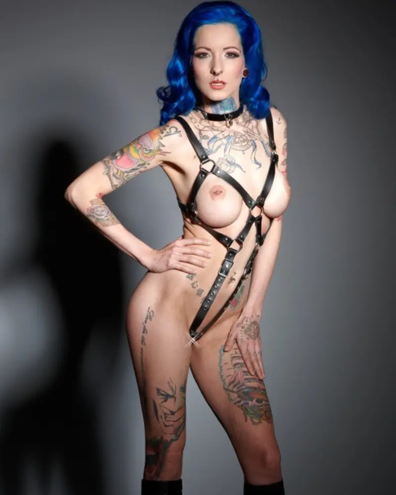 Kiváló minőségű, valódi bőr pántokból készült, extrém, nyitott body nőknek, fém karikákkal és szegecsekkel megbolondítva.