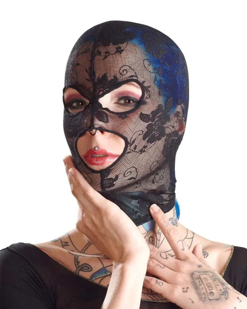 Enyhén rugalmas, finom kidolgozású, mintás, áttetsző fekete csipkéből készült maszk, szem- és szájnyílással.