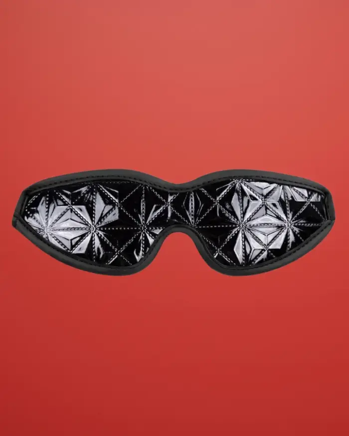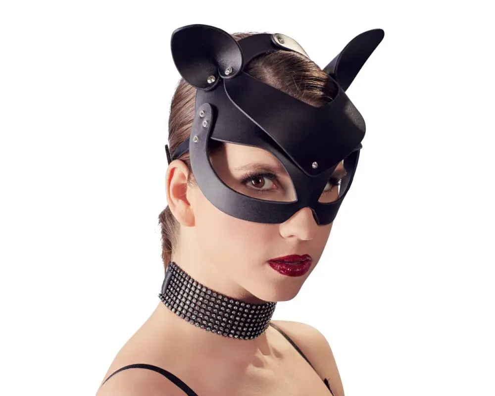 Állatian dögös, fekete fejmaszk, csillogó, strasszos rögzítésekkel, fém csatokkal állítható fejpánttal.