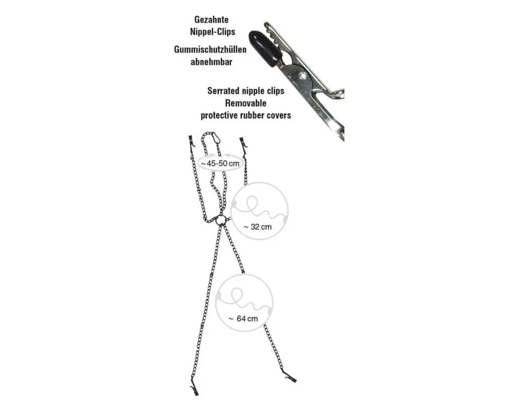 Uniszex mellcsipeszek, összekötő lánccal, melyek segítségével erőfölényt gyakorolhatsz alárendelteden. Ha nem engedelmeskedik, szorítsd meg jobban a mellcsipeszeket, vagy ha az sem lenne elég, akkor az összekötő lánccal vezesd!