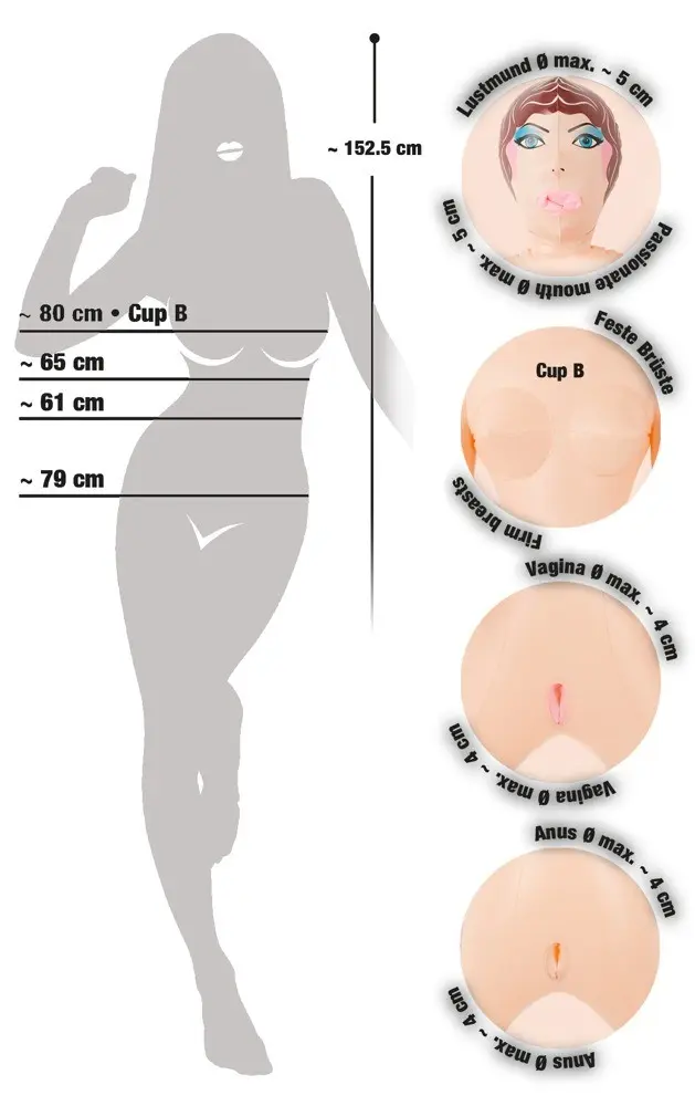 Életnagyságúra felfújható szexbaba, rajzolt bájos arccal és festett barna hajjal. Három kéjnyílással(száj, vagina, ánusz).